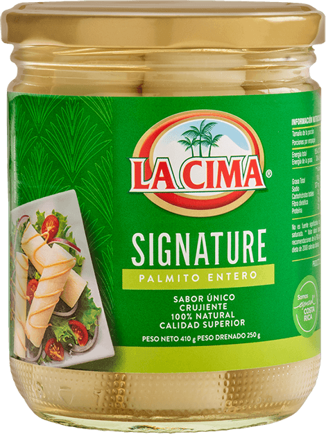 Palmito La Cima Signature ofrece a las personas la oportunidad de probar una nueva forma de consumir el palmito el cual se caracteriza: por su agradable, sabor natural y sin la acidez tradicional que caracteriza en general al palmito en conserva, a su vez con una textura más firme. La Cima Signature en un Palmito con un sabor único, de calidad superior, 100% natural, y con todos los beneficios que porta este noble vegetal al ser un producto practico, versátil, saludable, bajo en calorías, grasa y carbohidratos. Palmito La Cima Signature,